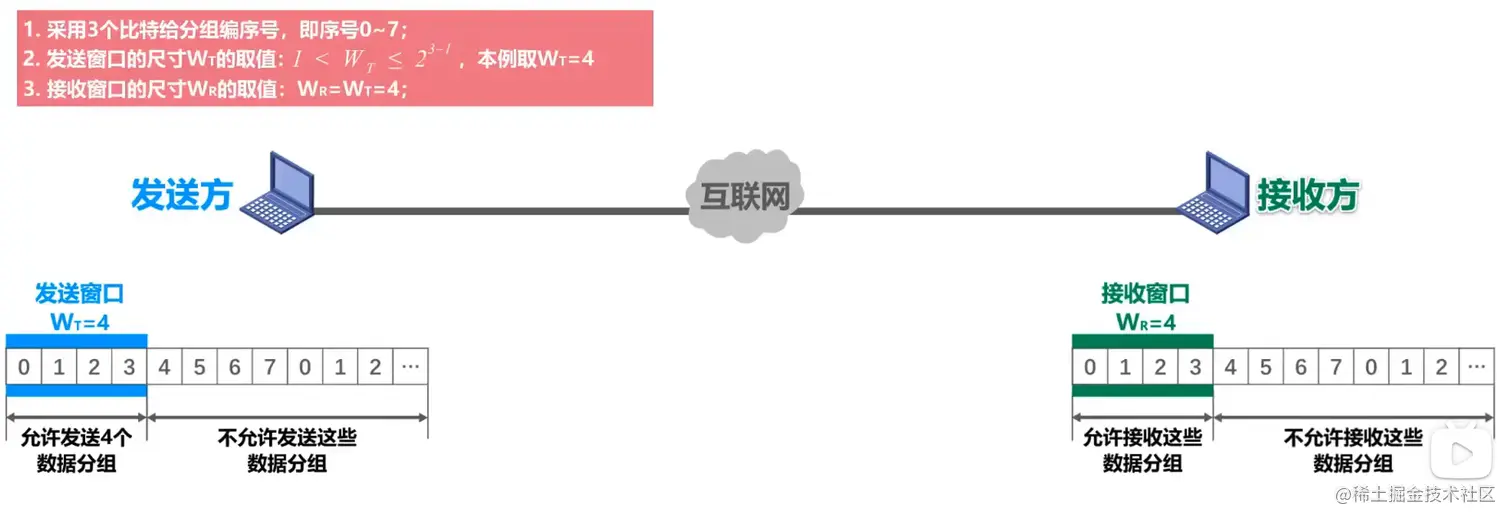 - 在协议的工作过程中发送窗口和接收窗口不断向前滑动,因为这类协议又称为滑动窗口协议。