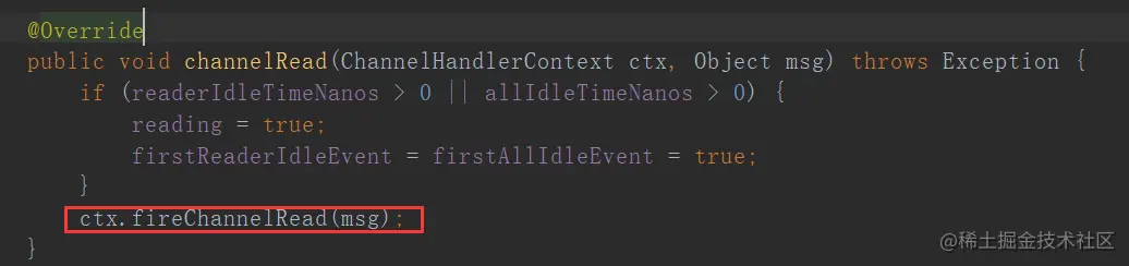红框代码其实表示该方法只是进行了透传,不做任何业务逻辑处理,让 channelPipe 中的下一个 handler 处理channelRead 方法