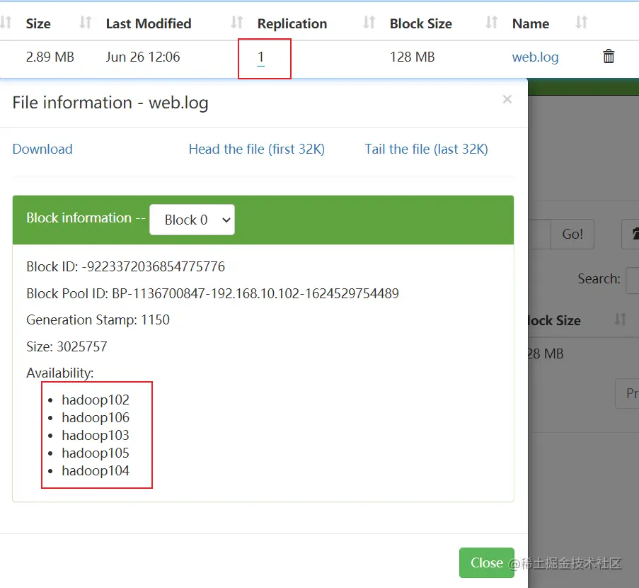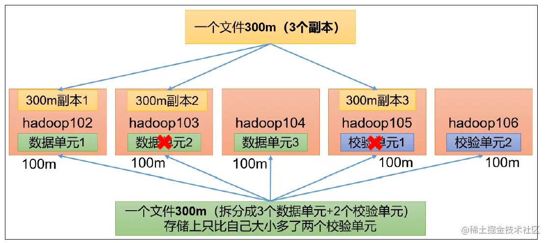 (3)RS-6-3-1024k:使用 RS 编码,每 6 个数据单元,生成 3 个校验单元,共 9 个单元,也就是说:这 9 个单元中,只要有任意的 6 个单元存在(不管是数据单元还是校验单元,只要总数 =6),就可以得到原始数据。每个单元的大小是 1024k=1024*1024=1048576。