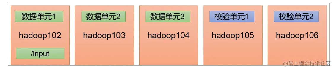 (1)RS-3-2-1024k:使用 RS 编码,每 3 个数据单元,生成 2 个校验单元,共 5 个单元,也就是说:这 5 个单元中,只要有任意的 3 个单元存在(不管是数据单元还是校验单元,只要总数=3),就可以得到原始数据。每个单元的大小是 1024k=1024*1024=1048576。