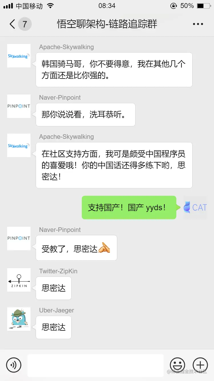 Skywalking 和 CAT: 这两款链路追踪组件都是国产的,对国内用户更友好,香!另外 CAT 早期开源的,现在社区不活跃了。Skywalking 还有官方 QQ 交流群,我天,这个要吹爆!