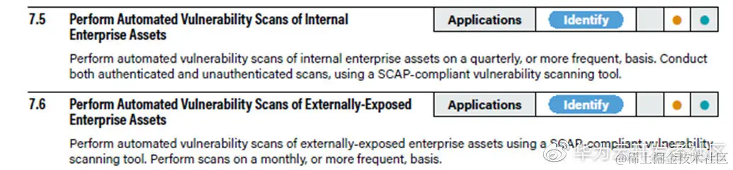 此外还有如CIS(Center for Internet Security)广为人知,其提出的的CISCritical Security Controls(通用安全控制框架)以及CIS Benchmark(安全配置基线)被很多大型公司参考引用,作为实施网络安全的最佳实践。在其安全控制框架中的第7条,则是明确提出了需要持续的进行漏洞管理。如何做呢? 对于安全要求级别高的用户,自动化的内网及外网漏洞扫描当然是必不可少的。