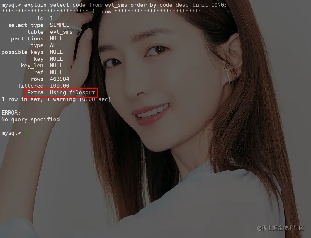 在Extra中显示的using filesort表示的就是排序,MySQL会给每个线程分配一块内存用于排序,也被称之为sort_buffer。这期文章和下期文章会牵扯到很多名词,记得自己整理一下哈!