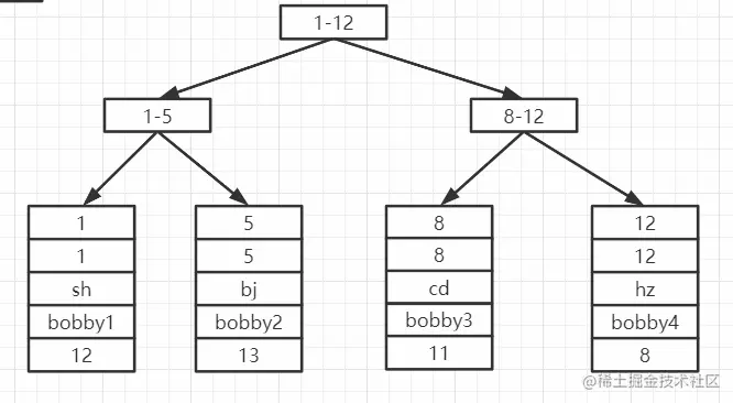 非叶子节点上的都是索引指针,叶子节点中存储了所有的元素与索引,并且排好了顺序