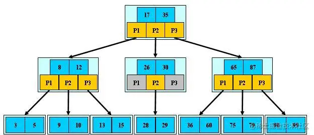如磁盘块1包含数据项17和35,包含指针P1、 P2、 P3