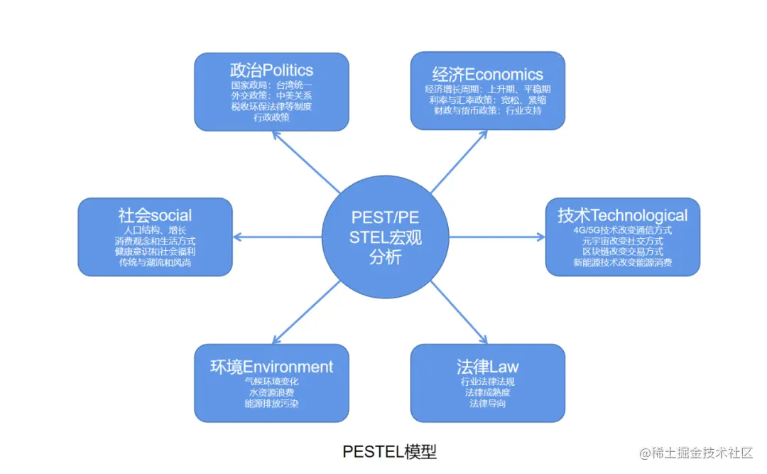内容:PEST模型或者PESTEL模型是从宏观角度出发分析企业的主要外部环境因素,应用于公司设立或重大业务转折时期。