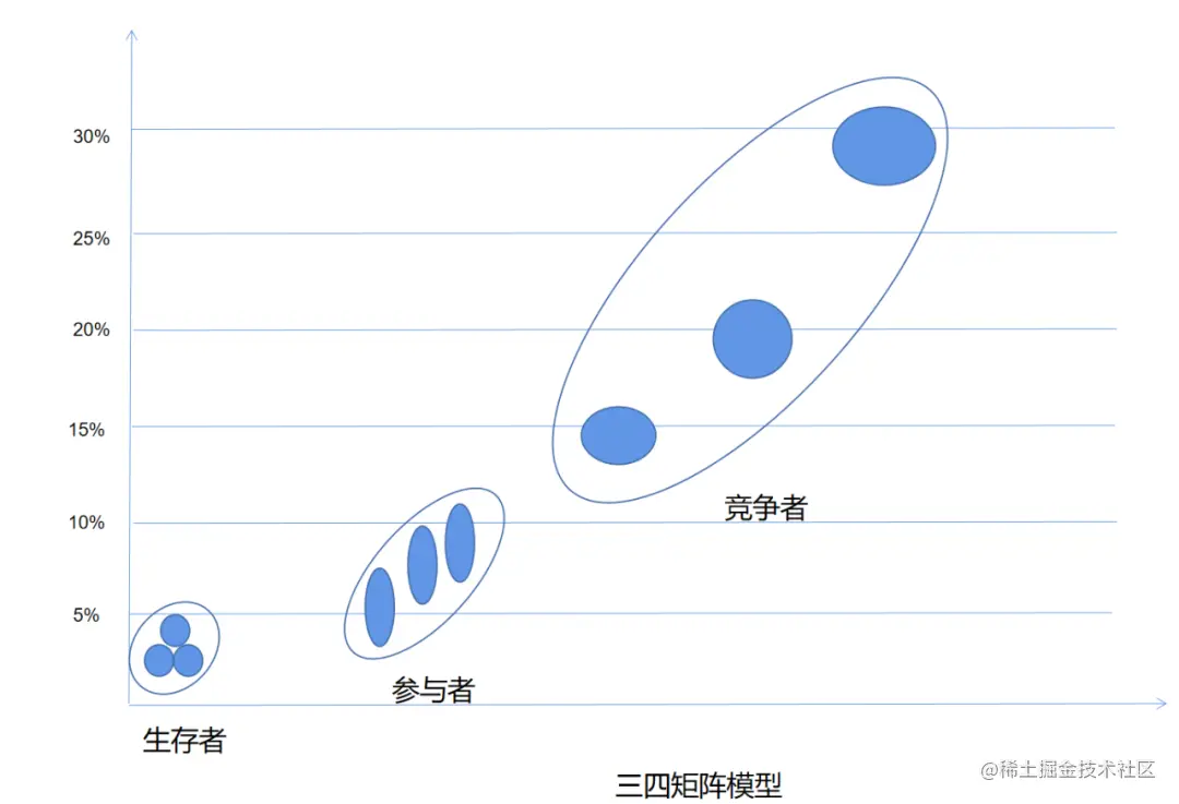 内容:在一个稳定的竞争市场中,参与市场竞争的参与者一般分为三类,领先者、参与者、生存者。优胜者一般是指市场占有率在15%以上,可以对市场变化产生重大影响的企业,如在价格、产量等方面;参与者一般是指市场占有率介于5%~15%之间的企业,这些企业虽然不能对市场产生重大的影响,但是它们是市场竞争的有效参与者;生存者一般是局部细分市场填补者,这些企业的市场份额都非常低,通常小于5%。这个模型用于分析一个成熟市场中企业的竞争地位。