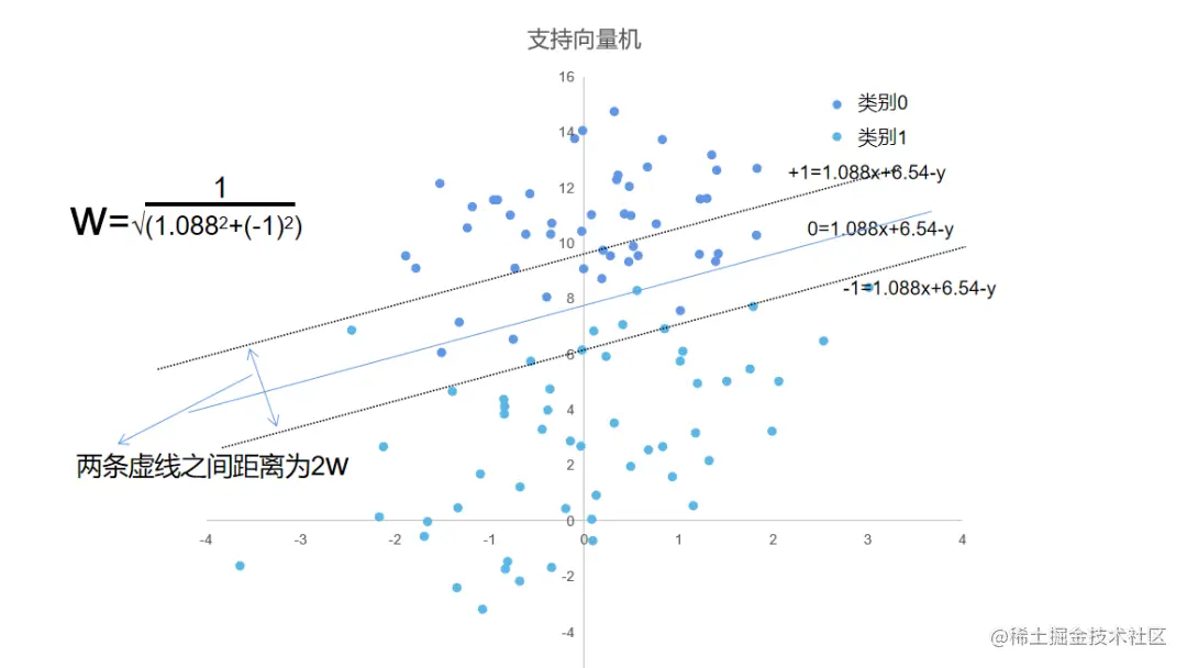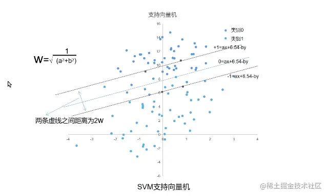 那它是怎么求出这个表达式的系数(a,b)呢?,实际上是通过计算离分割线最近的点,使得这些点到分割线的距离之和最大,上面的图可以看到计算点到直线的距离就是关于系数(a,b)的函数。为什么要使得这些点到分割线的距离之和最大?这些点是哪些点?