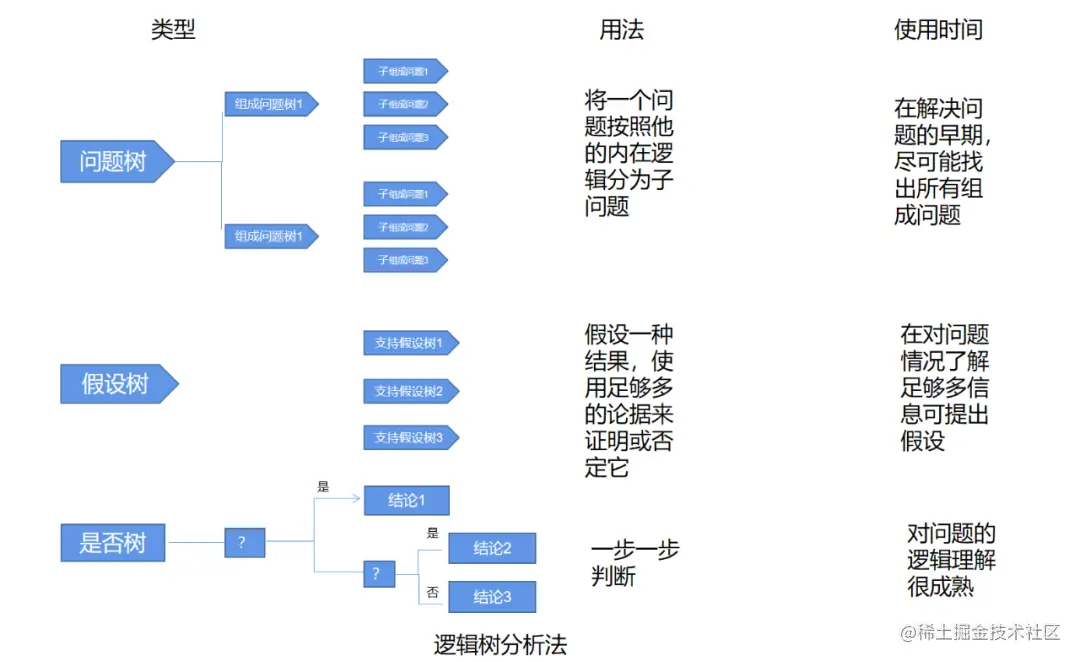 把一个已知问题当成树干,然后开始考虑这个问题和哪些相关问题或者子任务有关。每想到一点,就给这个问题(也就是树干)加一个“树枝”,并标明这个“树枝”代表什么问题。一个大的“树枝”上还可以有小的“树枝”,如此类推,找出问题的所有相关联项目。逻辑树主要是帮助你理清自己的思路,不进行重复和无关的思考。