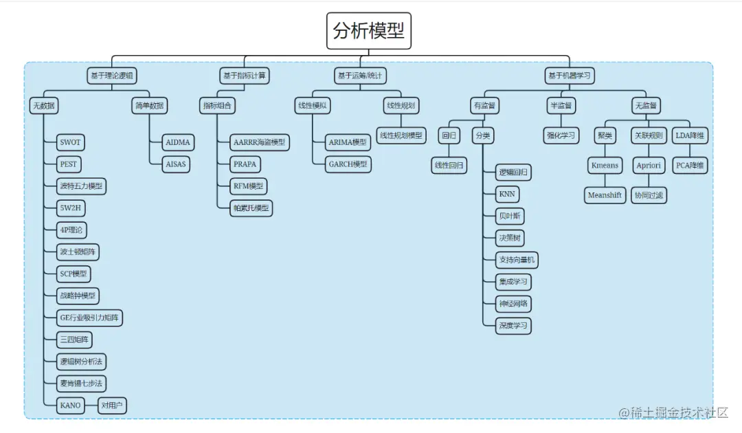 下面将要介绍的是经过实践检验的、适用于数据分析师的模型。本文不会详细解释每个模型的细节,只是企图先搭建一个框架,知道有哪些模型、什么场景下使用、说得清主要环节,后续会一一结合可视化工具PowerBI或Python具体实践。换句话说,你知道的足够多才有优势,具体的用什么学什么就可以了。