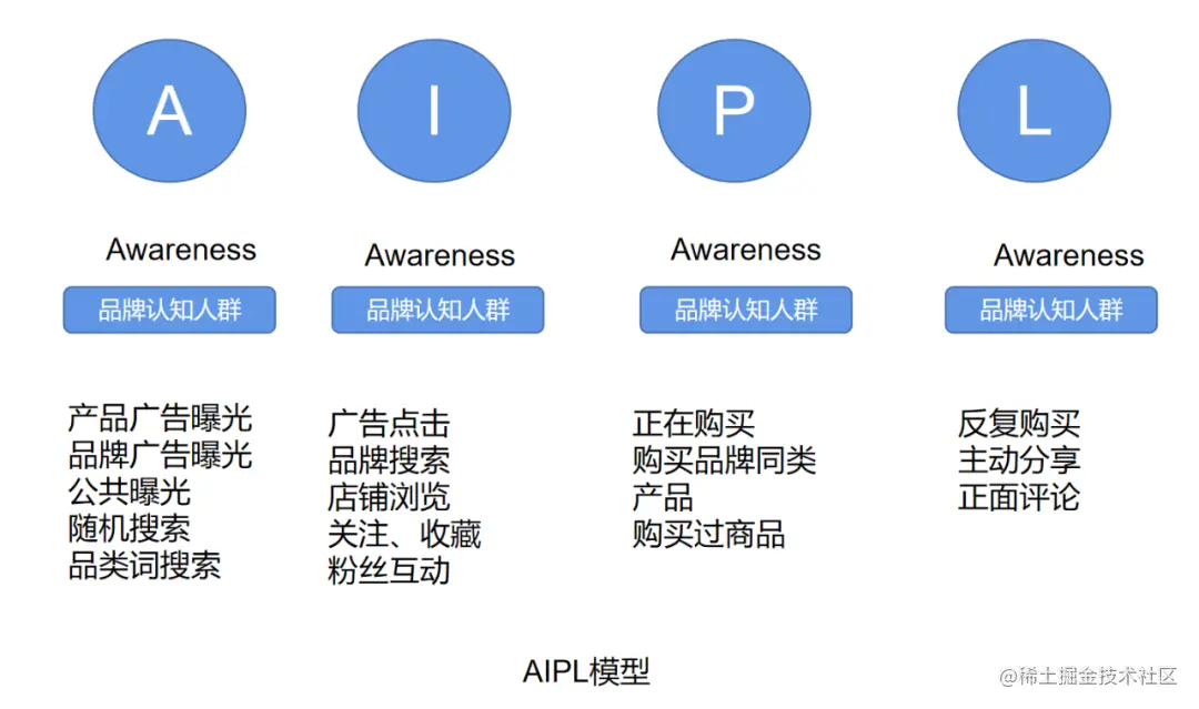 说到AARRR模型不得不说网传阿里巴巴所用的电商分析模型AIPL,它也来自上面的AIDMA营销模型的变种。