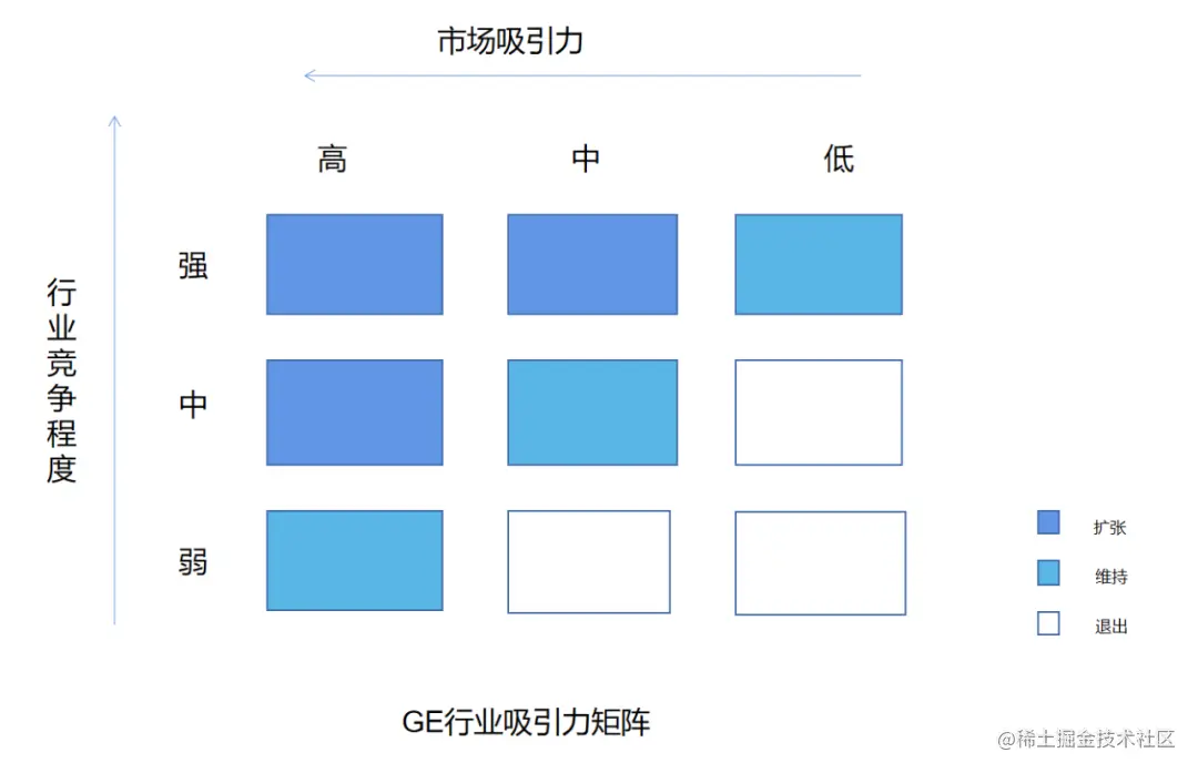 该模型是对波士顿矩阵的改进,应用于投资组合、业务组合的企业经营模型。这个矩阵可以更细化的说明产品所在行业的状况(比如波士顿矩阵中,偏向于现金牛的瘦狗中的产品,并不一定制定撤退战略就是妥善的。并且就算明星业务中,靠上的与靠下的所需要投入的投资比重也是不一样的)。九宫格中一旦企业在左上方三个格,一般情况下采用增长战略,右下方一般采用停止。对角一般采用调整。