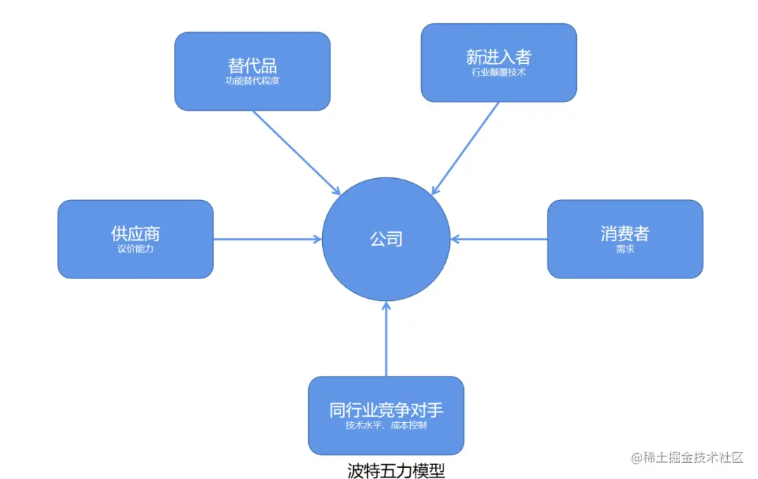 内容:这是用于行业战略制定的竞争力分析模型,应用于处于稳定成熟期的公司,无论是提供服务还是产品,此时已占有市场份额,但面临发展威胁。主要来自五种力量:同行业内现有竞争者的竞争能力、潜在竞争者进入的能力、替代品的替代能力、供应商的讨价还价能力与购买者的议价能力。