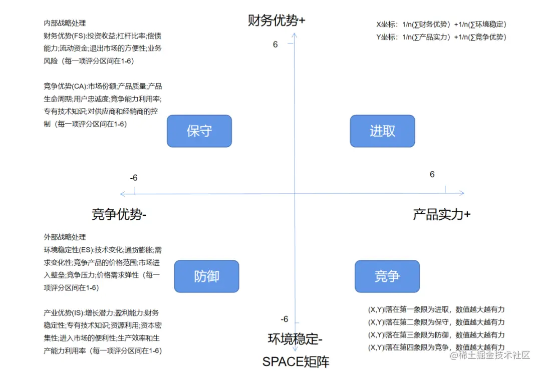 内容:SPACE矩阵有四个象限分别表示企业采取的进攻、保守、防御和竞争四种战略模式。这个矩阵的两个数轴分别代表了企业的两个内部因素: 财务态势(financial position,FP)和竞争优势(competitive position,CP);两个外部因素: 环境稳定性态势(stability position,SP)和产业态势(industry position,IP)。这四个因素对于确定企业总体战略地位起决定性作用。