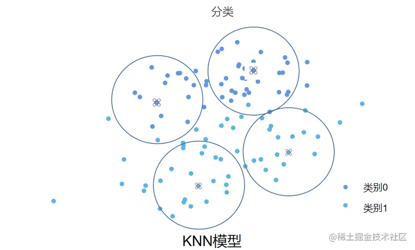 KNN模型的模型思想可以简单归结为“物以类聚,人以群分”,上面逻辑回归对分类不同的点通过SIGMOD函数来区分。而这个模型则是通过点与点之间距离远近来区分。对上面同一批数据点用KNN来划分: