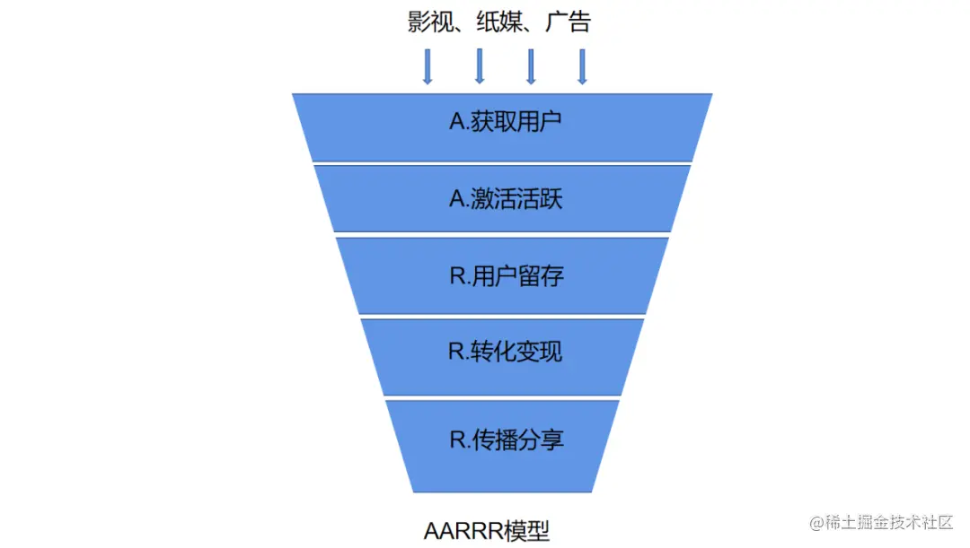 介绍完上面消费者行为三个模型后,再看下面AARRR模型,你会发现很眼熟,这也是现在凡是给你推荐模型的都会说到的用户增长模型,又叫海盗模型、漏斗模型。