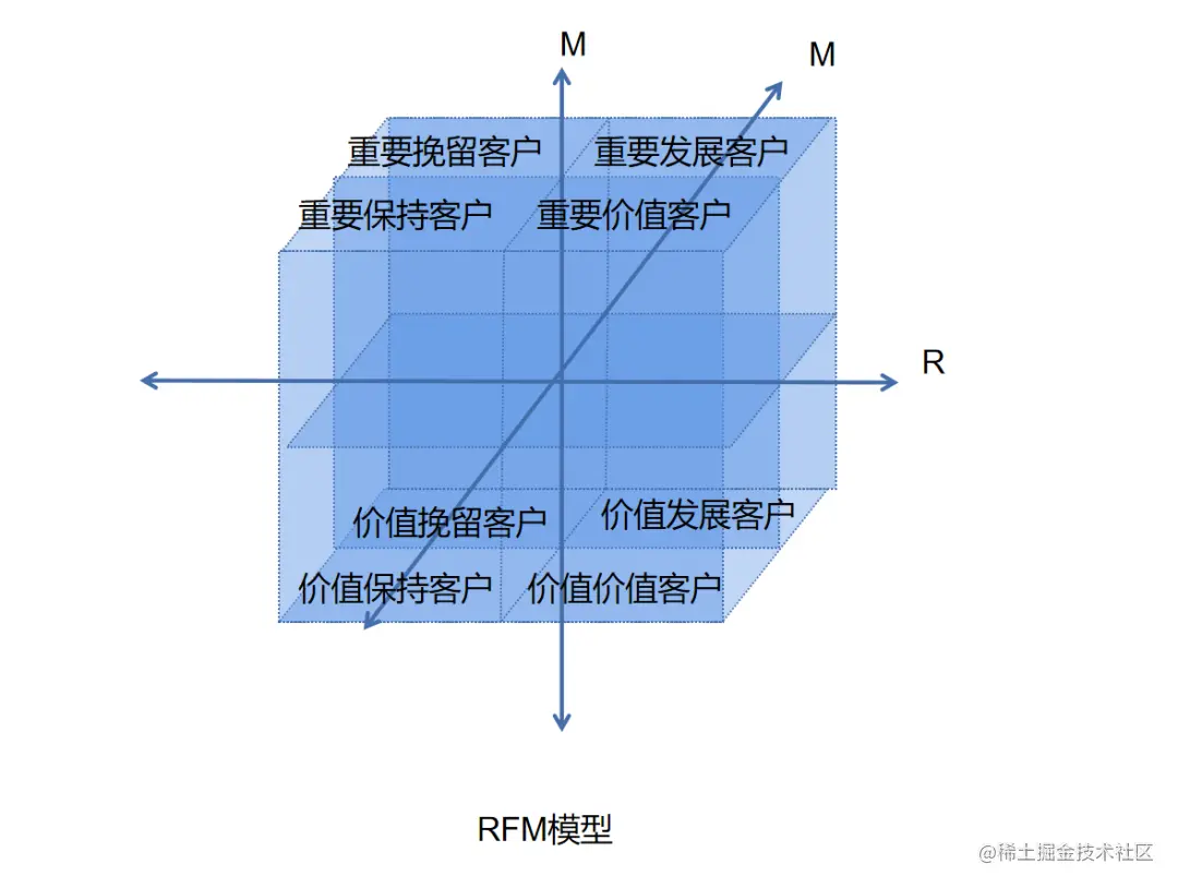 RFM模型是衡量客户价值和创利能力的重要工具和标准,该模型通过一个客户的近期购买行为R、购买的总体频率F和花了多少钱M三项指标来描述该客户的价值。