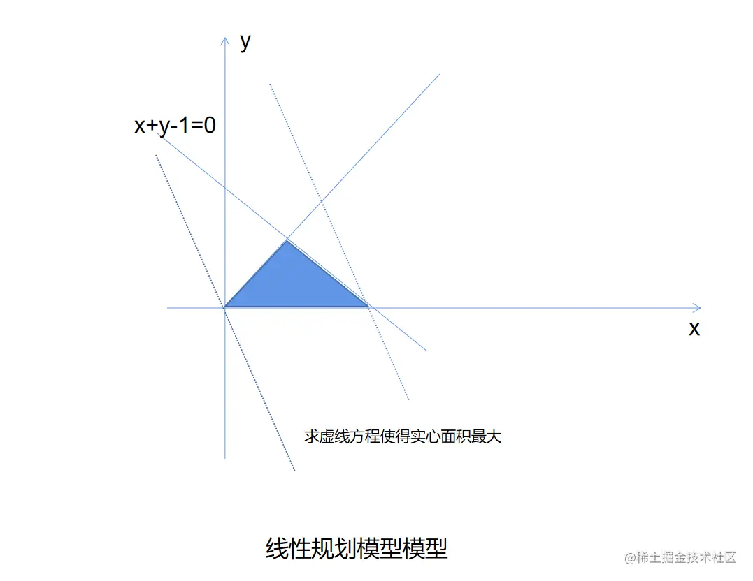 线性规划模型是指一种特殊形式的数学规划模型,即目标函数和约束条件是待求变量的线性函数、线性等式或线性不等式的数学规划模型。它所描述的典型问题是怎样以最优的方式在各项活动中间分配有限资源的问题。应用于经济分析、经营管理中,为合理地利用有限的人力、物力、财力等资源作出的最优决策。下图中是要找到最佳虚线的表达式来使得实心面积最大,约束条件就是组成实心面积的直线方程。