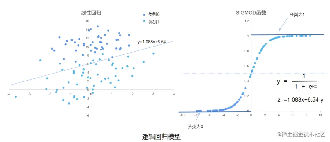 从上面左图可以看到深蓝色点代表类别为0,浅蓝色点代表类别为1,虽然我们将这些点画出散点图也通过颜色知道它的类别,但是我们用什么标准还衡量它为什么为0或1呢?如果来了新的点怎么预测他的类别呢?靠直观感受是不行的,因此用数学表达式来作为衡量模型: