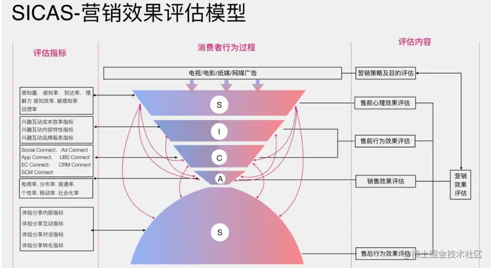 SICAS建立了一套开放式的营销效果评估模型,帮助品牌商家解决“我知道我的广告费浪费了一半,但是却不知道哪一半被浪费了!”,品牌商家首先要基于互联网的产品形态建立全网触点来实时感知消费者行为动态来敏捷指导、评估营销决策,让品牌信息能及时出现在消费者会关心会消费信息的地方,精细化销售效果评估数据精确考核ROI,品牌商家不仅要关注消费者的分享行为,还要参与、引导消费者的分享行为。