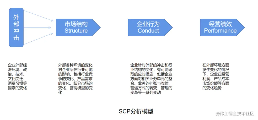内容:SCP 框架的基本涵义是,市场结构决定企业在市场中的行为,而企业行为又决定市场运行在各个方面的经济绩效。应用在行业或者企业受到表面冲击时,分析可能的战略调整及行为变化。