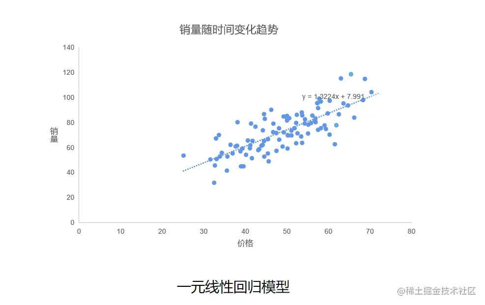 上面这个模型表示的是通过图上的数据(过去数据)来拟合一个线性回归表达式,如果给你新的数据x,可以通过这个表达式预测出y是多少。