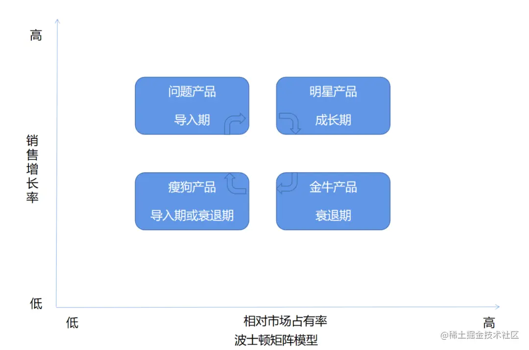 波士顿矩阵认为一般决定产品结构的基本因素有两个:即市场引力与企业实力。最主要的是反映市场引力的综合指标——销售增长率,这是决定企业产品结构是否合理的外在因素。企业实力包括市场占有率,技术、设备、资金利用能力等,其中市场占有率是决定企业产品结构的内在要素,它直接显示出企业竞争实力。销售增长率与市场占有率既相互影响,又互为条件:市场引力大,市场占有高,可以显示产品发展的良好前景,企业也具备相应的适应能力,实力较强;如果仅有市场引力大,而没有相应的高市场占有率,则说明企业尚无足够实力,则该种产品也无法顺利发展。相反,企业实力强,而市场引力小的产品也预示了该产品的市场前景不佳。通过以上两个因素相互作用,会出现四种不同性质的产品类型,形成不同的产品发展前景:①销售增长率和市场占有率“双高”的产品群(明星类产品);②销售增长率和市场占有率“双低”的产品群(瘦狗类产品);③销售增长率高、市场占有率低的产品群(问题类产品);④销售增长率低、市场占有率高的产品群(金牛类产品)。