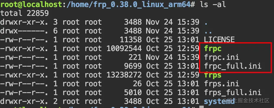 客户端的安装,跟服务端类似,只是安装包不同,因为是arm平台,则是下载frp_0.38.0_linux_arm64安装包。