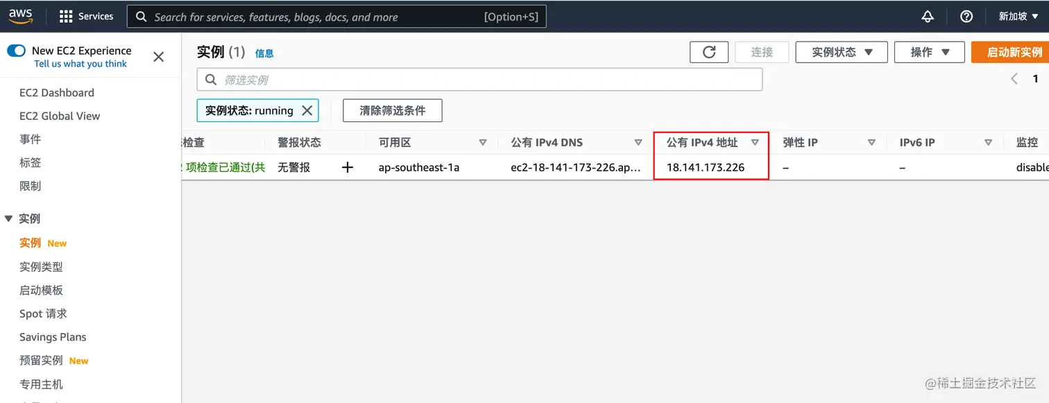 1.登录亚马逊云,记录下这个公网IP,在后续的Frpc客户端安装配置中需要用到。
