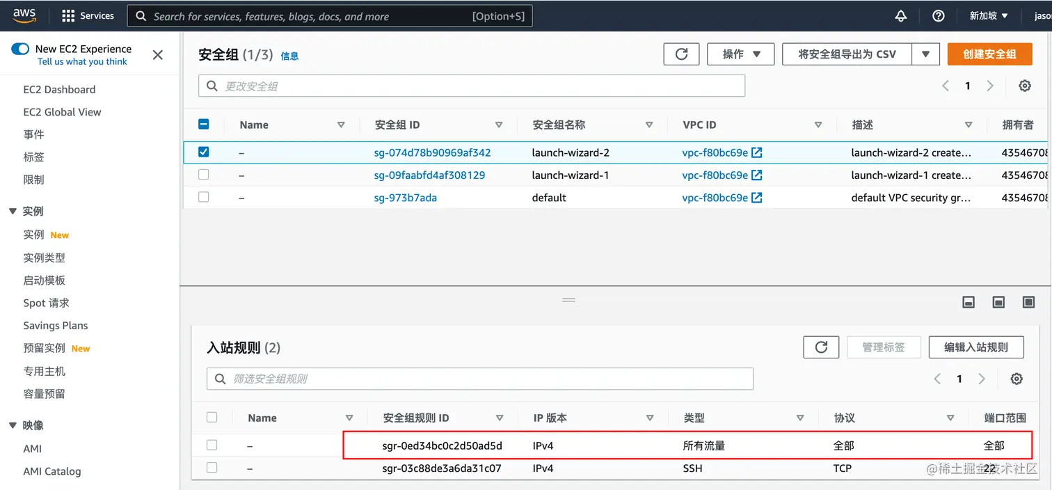 5.对防火墙的端口进行设置,必须得允许这些端口的流量入站与出站。这儿为了简单,就设为允许全部端口与全部协议。此步骤很重要,千万不能忘记。
