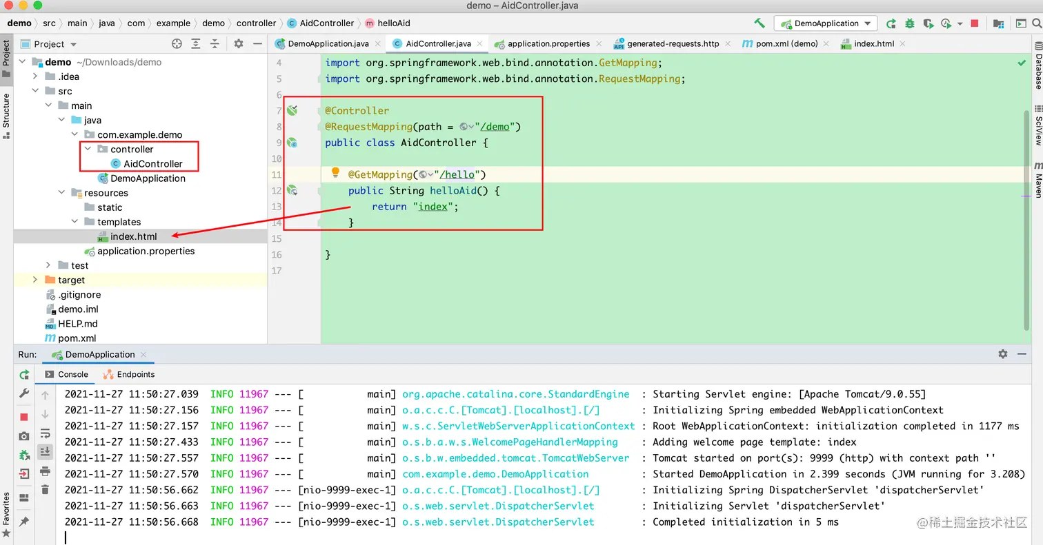 1.一个Controller类,当请求"/demo/hello"的时候,渲染index.html文件内容。