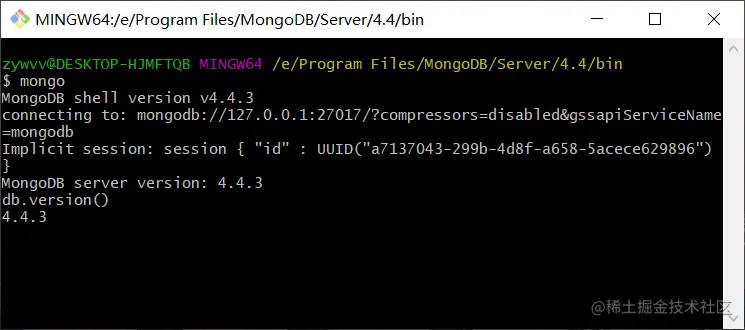 - 如果你需要进入MongoDB后台管理,你需要先打开mongodb装目录的下的bin目录,然后执行mongo命令文件。