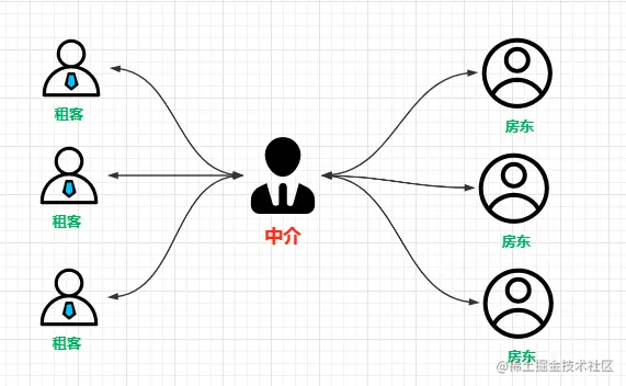 而中介就是为了专门解决租客和房东直接沟通(通信)的问题,来降低我和房东的沟通成本(耦合度和复杂度),沟通模式变成下面这样。