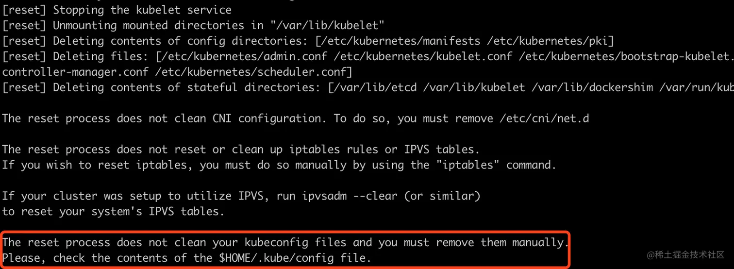 昨天按照教程搭建了一个集群,今天想重新实验下,于是执行kubeadm reset命令清除集群所有的配置。