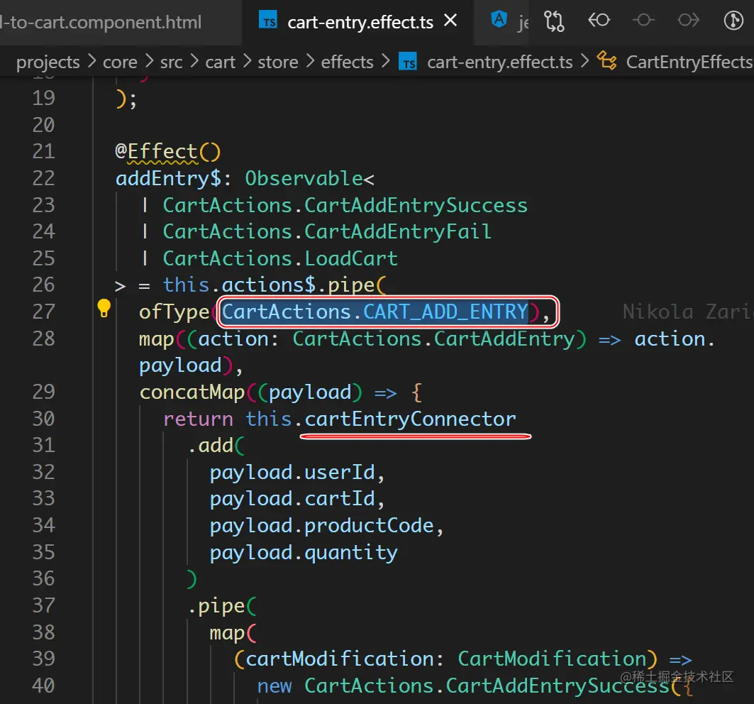 下图就是负责接收 CartActions.CartAddEntry 的 Effects 实现,后者又会将这个添加购物车请求,投递给 CartEntryConnector.