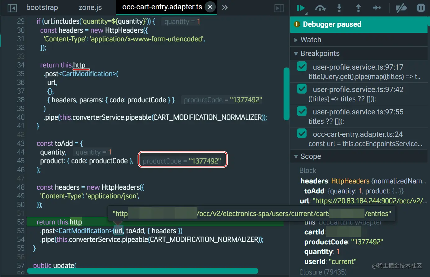 最终,我们在 OccCartEntryAdapter 的实现代码里,发现这个类,从配置信息里读取并生成后台对应的购物车更新的 API endpoint,然后使用注入的 HttpClient 的 post 方法(下图第35行代码),根据生成的 endpoint 调用这个 API,最终完成购物车更新操作。