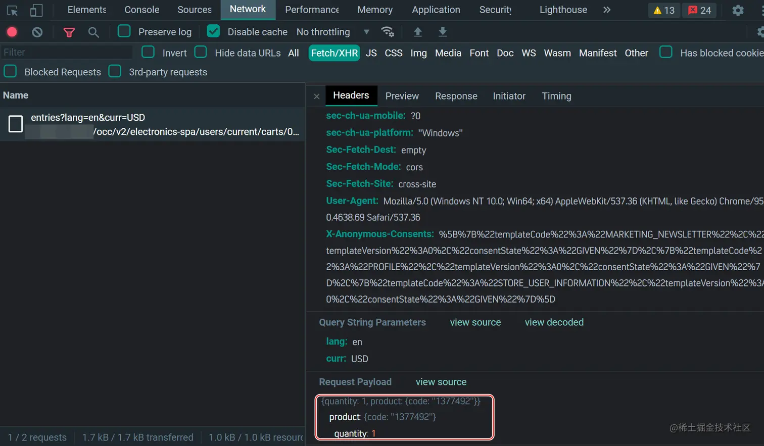 上图展示的该 POST 请求的负载里,包含 ID 为 1377492 的产品信息。这个 HTTP POST 请求调用购物车更新的 Restful API , 将客户选中的产品添加到购物车里。