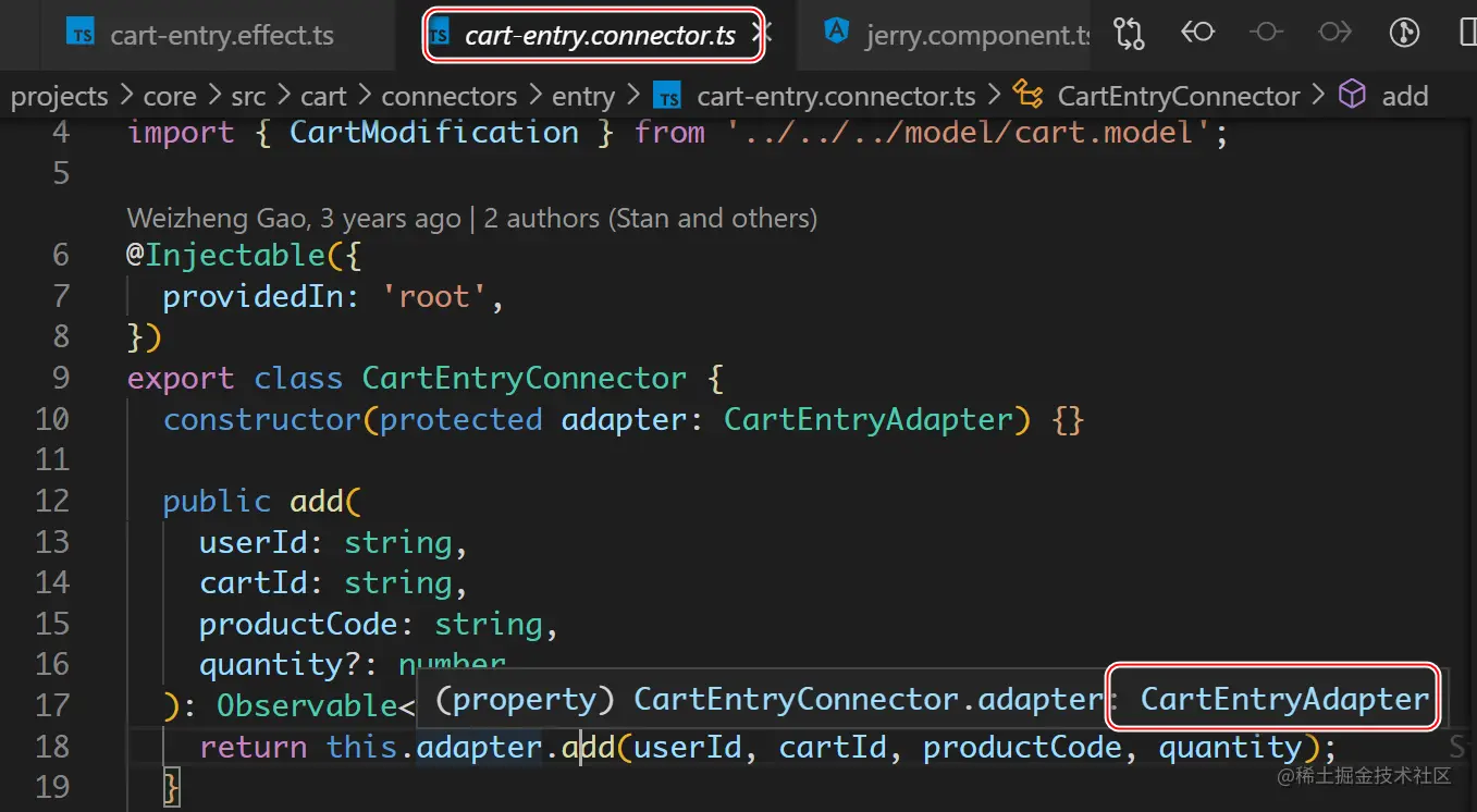 Connector 会把添加购物车的请求转发给 Adapter(即下图第18行的 this.adapter),由后者调用 HTTP Restful API.