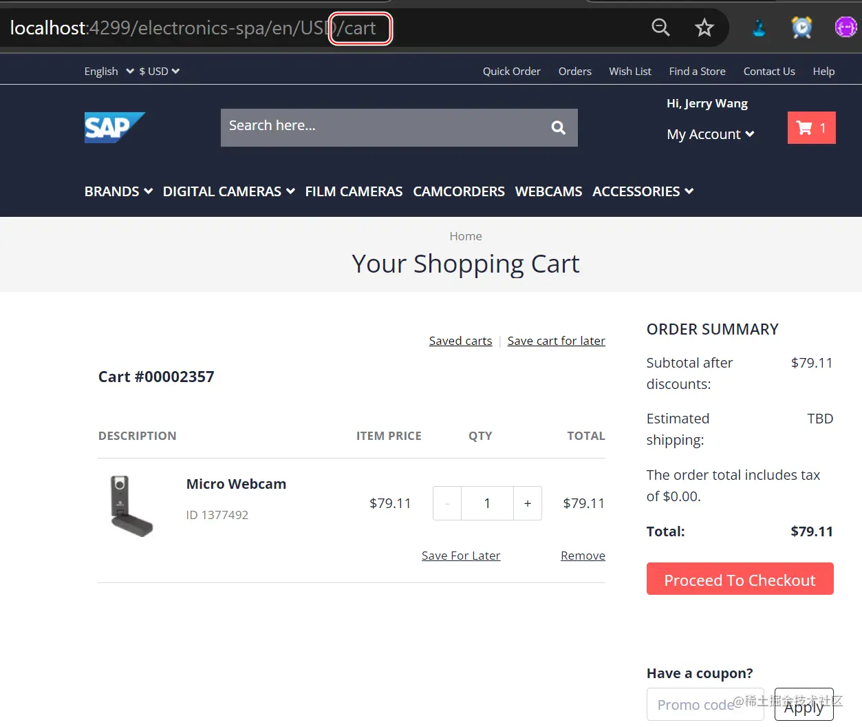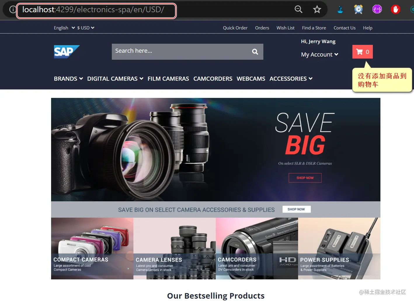 可以看到此时右上角红色的购物车图标显示的数字为0,意思是当前用户 Jerry Wang,还没有添加任意的商品到购物车里。