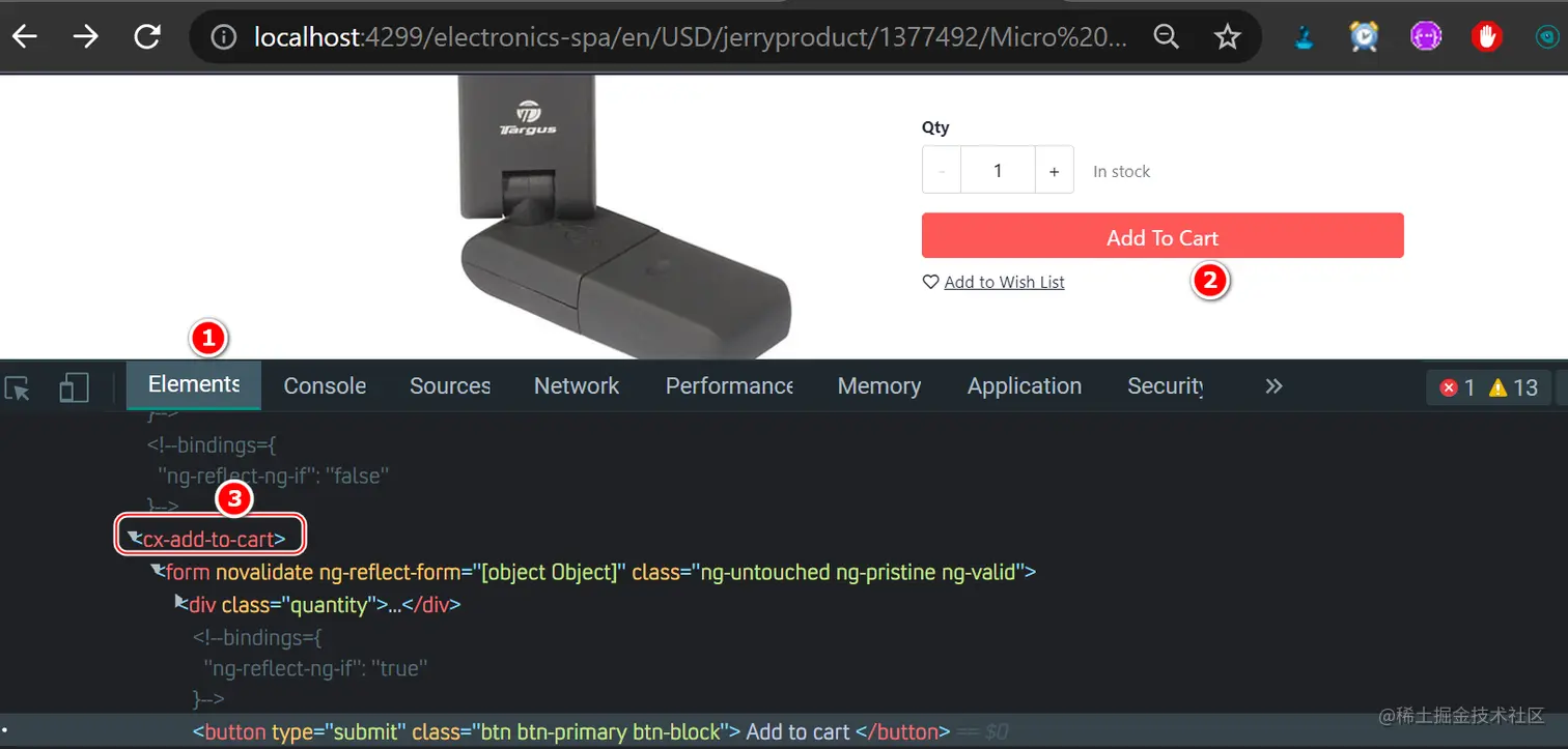 使用 Chrome 开发者工具,很快就能找到这个按钮所在的 Angular Component 的 selector:cx-add-to-cart