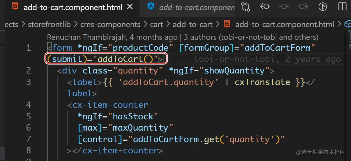 我们到该 Component 对应的模板文件头部查看,发现了 submit 事件的处理函数为 addToCart: