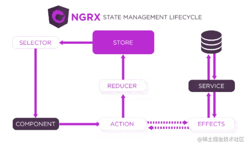 根据 NgRx 的架构图,这些投递出的 Action,最终会被 Effects 接收,后者会调用 Restful API 同后台服务器通信。