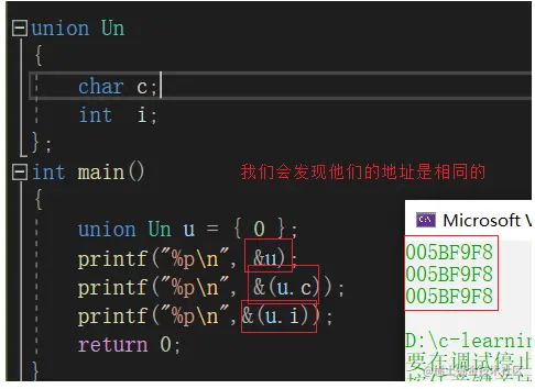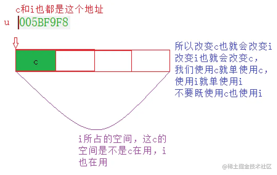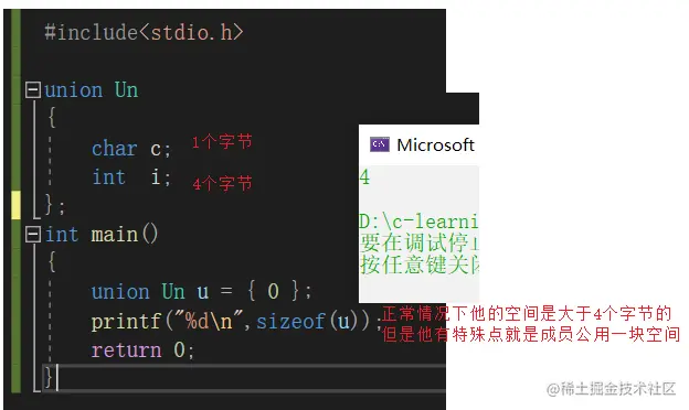 联合的成员是共用同一块内存空间的,这样一个联合变量的大小,至少是最大成员的大小(因为联合至少得有能力保存最大的那个成员)