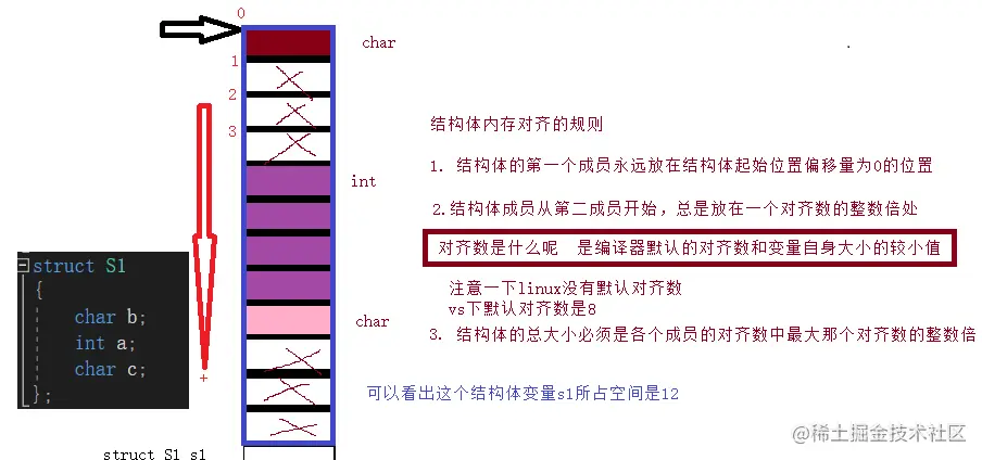 - 对齐数是什么呢是编译器默认的对齐数和变量自身大小的较小值注意一下 linux没有默认对齐数 vs下默认对齐数是8