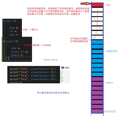 - 如果嵌套了结构体的情况,嵌套的结构体对齐到自己的最大对齐数的整数倍处,结构体的整体大小就是所有最大对齐数(含嵌套结构体的对齐数)的整数倍