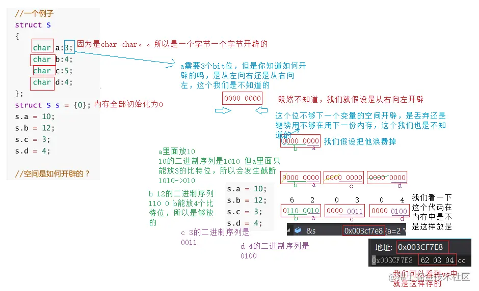 - 当一个结构包含两个位段,第二个位段成员比较大,无法容纳于第一个位段剩余的位时,是舍弃剩余的位还是利用,这个也是不确定的。