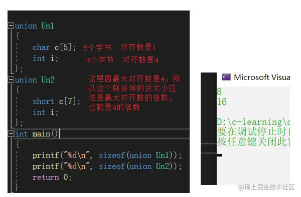 联合的大小至少是最大成员的大小。 当最大成员大小不是最大对齐数的整数倍的时候,就要对齐到最大对齐数的整数倍。