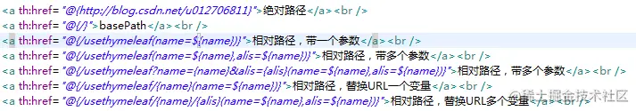 代码分析 1.最终解析的href为: /seconddemo/ /seconddemo/usethymeleaf?name=Dear 相对路径,带一个参数 /seconddemo/usethymeleaf?name=Dear&alis=Dear 相对路径,带多个参数 /seconddemo/usethymeleaf?name=Dear&alis=Dear 相对路径,带多个参数 /seconddemo/usethymeleaf/Dear 相对路径,替换URL一个变量 /seconddemo/usethymeleaf/Dear/Dear 相对路径,替换URL多个变量 2.URL最后的(name=${name})表示将括号内的内容作为URL参数处理,该语法避免使用字符串拼接,大大提高了可读性 3.@{/usethymeleaf}是Context相关的相对路径,在渲染时会自动添加上当前Web应用的Context名字,假设context名字为seconddemo,那么结果应该是/seconddemo/usethymeleaf,即URL中以”/“开头的路径(比如/usethymeleaf将会加上服务器地址和域名和应用cotextpath,形成完整的URL。 4.th:href属性修饰符:它将计算并替换使用href链接URL 值,并放入的href属性中。 5.th:href中可以直接使用静态地址