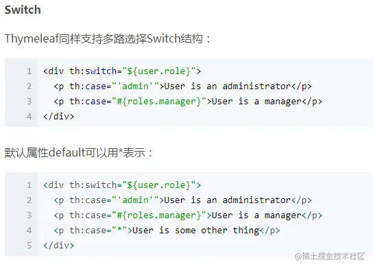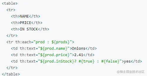 示例一: <h2 th:text="${expression} ? 'Hello' : 'Something else'"></h2> 示例二: <!-- IF CUSTOMER IS ANONYMOUS --> <div th:if="${customer.anonymous}"> <div>Welcome, Gues!</div> </div> <!-- ELSE --> <div th:unless="${customer.anonymous}"> <div th:text=" 'Hi,' + ${customer.name}">Hi, User</div> </div> -