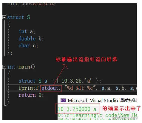 fprintf(stdout, "%d %lf %c", s.a, s.b, s.c);